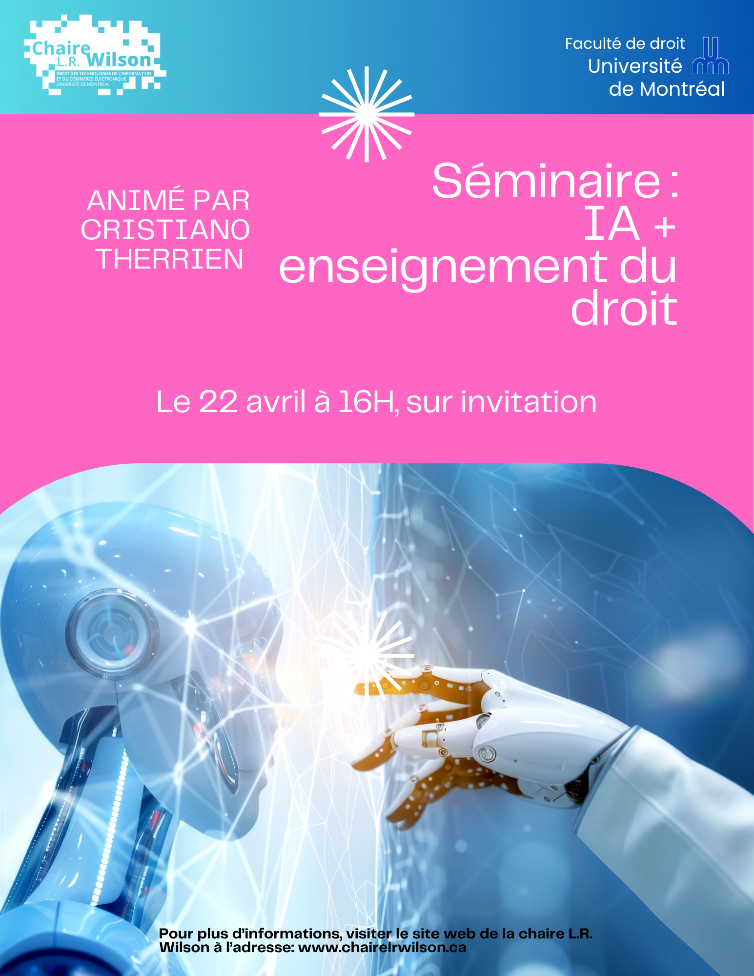 La Chaire L.R. Wilson a le plaisir d’organiser un séminaire portant sur les impacts, les enjeux et les questions autour de l’IA dans l’enseignement du droit. Ce séminaire sera animé par l’excellent Cristiano Therrien.